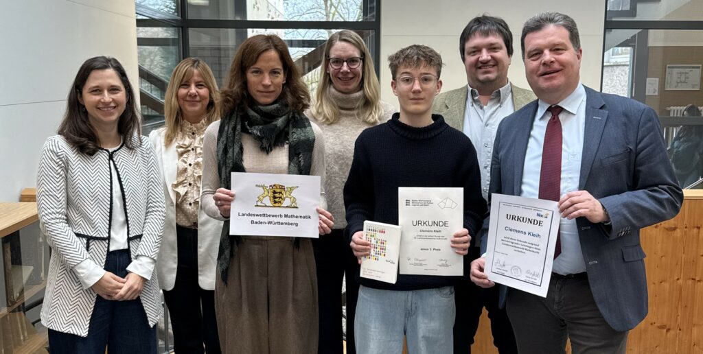Groß war die Freude am Nicolaus-Kistner-Gymnasium (NKG) als dieser Tage eine Urkunde für Clemens Kleih aus der Klasse 10a angekommen ist, die ihn mit dem dritten Preis beim Landeswettbewerb Mathematik auszeichnete. Die Urkunde ist unterschrieben von Ministerin Schopper und dem Verantwortlichen des Landeswettbewerbs, Torsten Rupf. Zusätzlich ist mit der Urkunde der Buchpreis ,,Das kleine Einmaleins des klaren Denkens‘‘ von Christian Hesse verbunden. Schulleiter Jochen Herkert und seine Stellvertreterin Elvira Horvath gratulierten Clemens Kleih und brachten dabei wie Klassenlehrerin Barbara Castano-Cabrales, Abteilungsleiter Dominik Diemer, Mathematiklehrerin Saskia Jammernegg  und die Fachbeauftragte für Mathematik Veronika Wedl ihre Hochachtung für diese Auszeichnung zum Ausdruck. Der Wettbewerb zielt darauf ab, dass Jugendliche, die Spaß an der Mathematik haben, ihre Fähigkeiten erproben und weiterentwickeln. Seit 1987 veranstaltet das Ministerium für Kultus, Jugend und Sport Baden-Württemberg den Landeswettbewerb Mathematik, der sich an leistungsstarke Schülerinnen und Schüler bis Klassenstufe 10 richtet und an dem in diesem Jahr fast 500 Teilnahmen zu verzeichnen waren. Der Landeswettbewerb in Baden-Württemberg stellt Anforderungen, die über den regulären Mathematikunterricht hinausgehen. Gefragt sind nicht nur korrekte Endergebnisse, sondern vor allem eigenständige Lösungswege, vollständige Beweise und mathematische Präzision. Deshalb passe der Landeswettbewerb Mathematik hervorragend in das Bildungssystem des NKG, das die gesamte Region im bundesweiten Netzwerk der MINT – excellence – Gymnasium vertritt, und trage dadurch wesentlich zur individuellen Förderung der Schülerinnen und Schüler bei, so Schulleiter Herkert. Zusätzlich erhielt Clemens Kleih aufgrund der besonderen Auszeichnung noch eine Urkunde vom Nicolaus-Kistner-Gymnasium. Am NKG versteht man den Landeswettbewerb Mathematik als eine besondere Form der Begabtenförderung. Er soll für jüngere Schülerinnen und Schüler eine Anregung sein, ihre mathematischen Begabungen zu testen und weiterzuentwickeln und die Bearbeitung von komplexeren Problemen kann gerade auf Schülerinnen und Schüler der Unter- und Mittelstufe eine besondere Motivation ausüben. Besonders bei komplex begabten Jugendlichen ist es wichtig, schon in der Mittelstufe ansprechende Fördermöglichkeiten anzubieten und sie mit ähnlich interessierten Altersgenossen in Kontakt zu bringen.