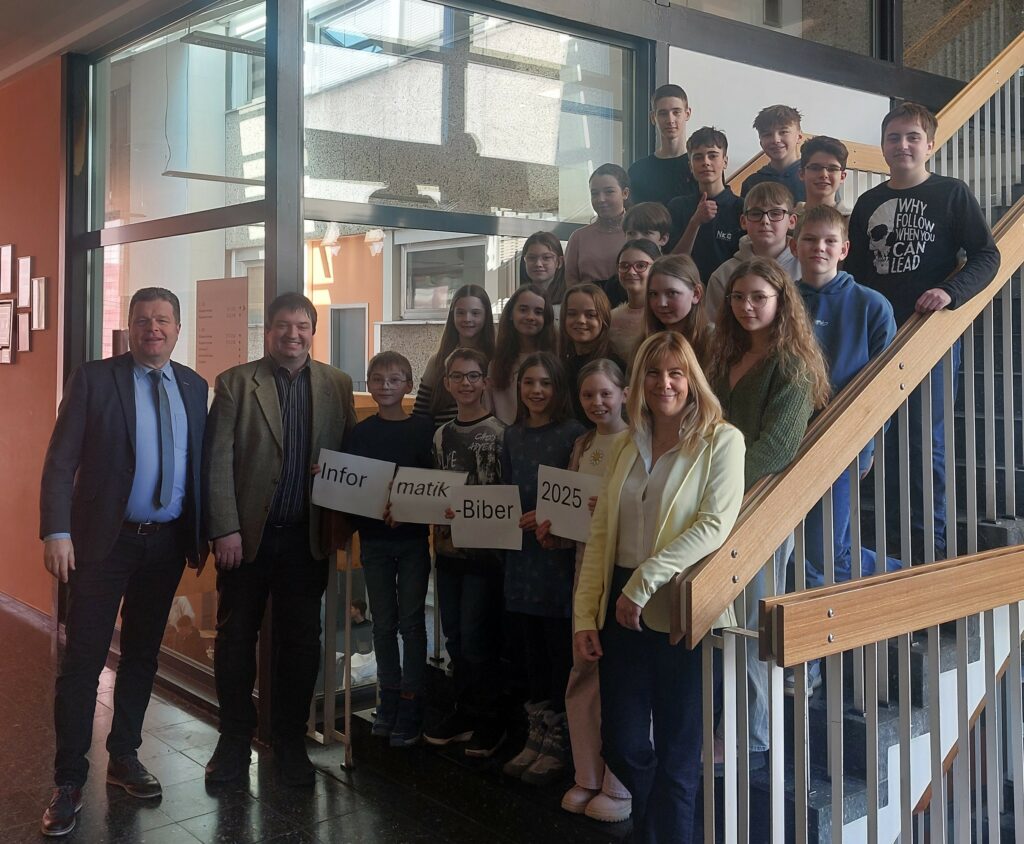Der bundesweit größte Onlinewettbewerb des Fachbereichs Informatik, der ,,Informatik – Biber‘‘, erfreut sich weiter großer Beliebtheit und auch in diesem Schuljahr hat das Mosbacher Nicolaus-Kistner-Gymnasium (NKG) wieder erfolgreich teilgenommen. Insgesamt 235 Schülerinnen und Schüler der Klassenstufen 5 bis 12 stellten sich den spannenden und kniffligen Aufgaben rund um Logik, Algorithmen und Problemlösestrategien. Gefördert wird der Wettbewerb vom Bundesministerium für Bildung, Familie, Senioren, Frauen und Jugend und er gehört zu den von der Kultusministerkonferenz empfohlenen Schülerwettbewerben, die unter der Schirmherrschaft des Bundespräsidenten stehen. Das Max-Planck-Institut für Informatik und der Fraunhofer-Verbund unterstützen den Informatik-Biber genauso wie die Gesellschaft für Informatik. Das Engagement und die Begeisterung der Teilnehmenden wurden am NKG mit großartigen Ergebnissen belohnt. 12 erste Preise und 23 zweite Preise konnten ebenso vergeben werden wie 90 dritte Ränge. Dieses Ergebnis zeigt eindrucksvoll, wie breit das Informatikinteresse und die nötigen Kompetenzen hierzu am NKG verankert sind. Insbesondere waren von den jüngsten Teilnehmerinnen und Teilnehmern bis hin zur Oberstufe eine Vielzahl von Schülerinnen und Schülern erfolgreich. Der Informatik-Biber verfolgt das Ziel, informatisches Denken auf spielerische Weise zu fördern und Schülerinnen und Schüler unabhängig von Vorkenntnissen für Informatik zu begeistern. Dass so viele Lernende am NKG mit Freude und Erfolg teilgenommen haben, ist ein starkes Zeichen für die Bedeutung dieses Fachs im Schulalltag. Dieser Wettbewerb passt damit optimal in das Bildungsangebot des Nicolaus-Kistner-Gymnasiums, das zu den wenigen ausgewählten ,,MINT – excellence – Gymnasien‘‘ in Deutschland gehört. Das Fach Informatik ist dabei im NKG in den Abiturprüfungen als vollwertige Naturwissenschaft wählbar und das Fach IMP (Informatik, Mathematik, Physik) in der Mittelstufe als Profilfach. Das Unterrichtsfach Informatik und Medienbildung wird im neuen System G9Neu sogar in jeder Klassenstufe unterrichtet. Zusätzlich dürfen die Gymnasien in Zukunft auch das neue Profilfach NIT anbieten, das die Kinder im Fach Informatik und im naturwissenschaftlichen Bereich besonders fördert. Die erfolgreichen Schülerinnen und Schüler wurden von Schulleiter Jochen Herkert, seiner Stellvertreterin Elvira Horvath und Abteilungsleiter Dominik Diemer empfangen und durften dabei die Glückwünsche in Empfang nehmen. Der Dank der Schulleitung ging dabei auch an Studiendirektor Diemer für seinen Einsatz für das Fach Informatik. Neben den vielen Anerkennungen und 90 dritten Rängen haben 23 einen zweiten Preis gewonnen und gehören somit zu den besten fünf Prozent aller Teilnehmenden. Darüber hinaus stechen jedoch noch die Leistungen der 12 Schülerinnen und Schülern, hervor, die einen ersten Preis gewonnen haben und somit deutschlandweit zu den besten zwei Prozent der Teilnehmenden zählen. Herzlichen Glückwunsch an alle Preisträgerinnen und Preisträger sowie ein großes Dankeschön an alle Teilnehmenden für ihren Einsatz!