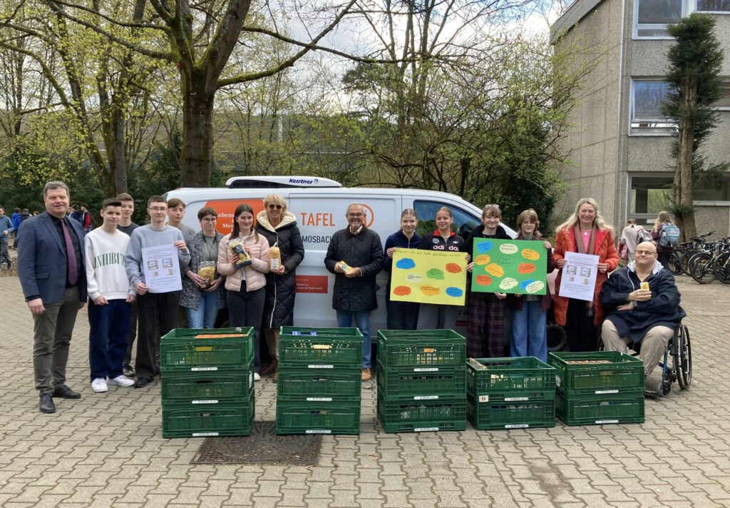 Wie in den Vorjahren hatte die Fachschaft Religion mit Pfarrerin und Religionslehrerin Dr. Heike Vierling-Ihrig an der Spitze zu Spenden unter dem Motto „Den Nächsten in unserer Mitte nicht vergessen“ aufgerufen. Der Slogan „Haste mal zwei Euro für mich?“ kam wieder gut an. Für zwei Euro kann man beispielsweise ein Päckchen Mehl, Zucker oder Nudeln und Reis kaufen. Das taten Schülerinnen und Schüler, Eltern und Lehrkräfte. Sie lieferten 796 Pakete ab – fast 300 mehr als im Vorjahr. Eine Lehrkraft brachte sogar über 70 Päckchen unterschiedlicher Ware.