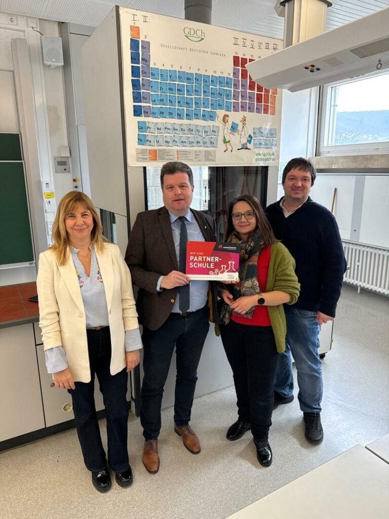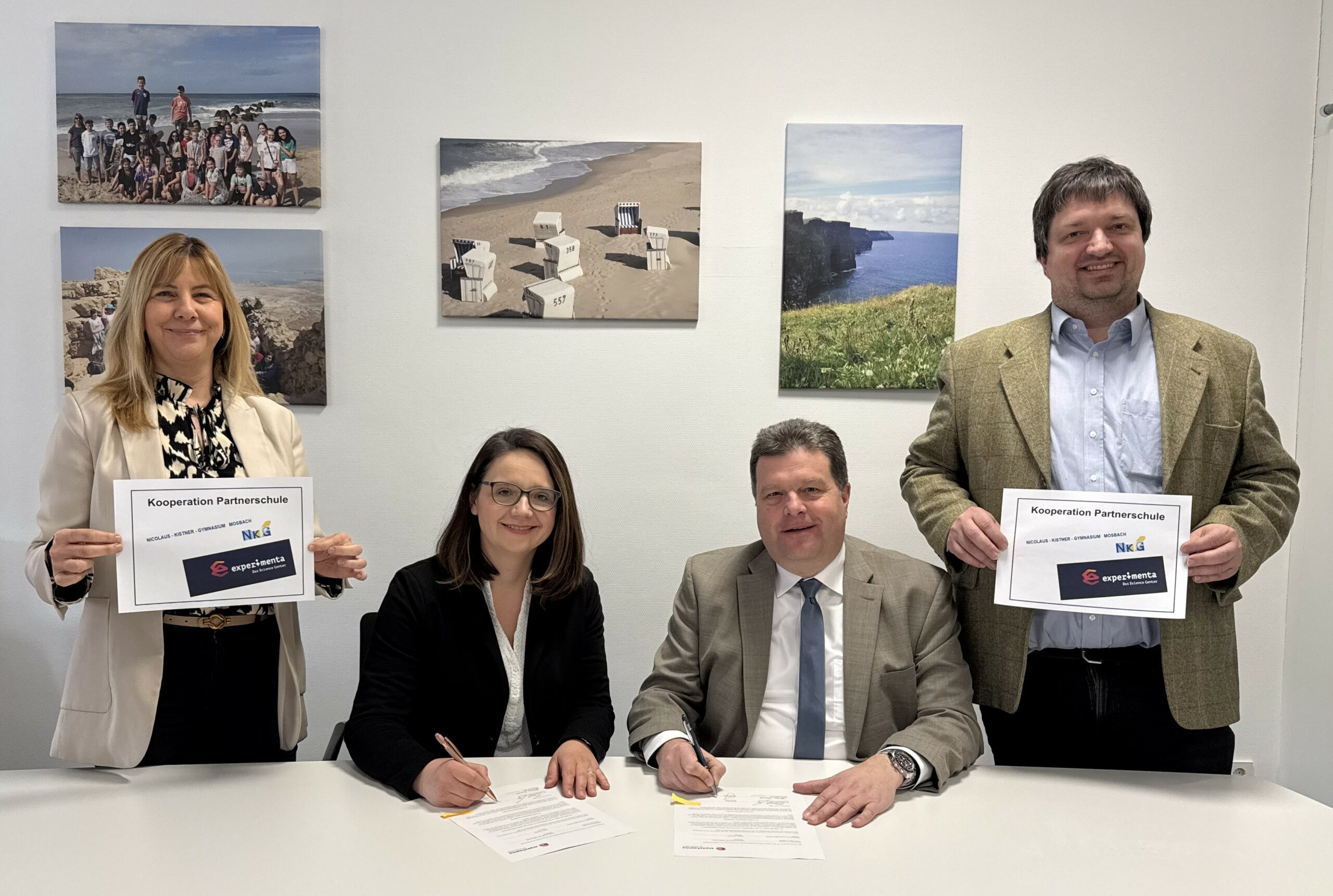 Das Nicolaus-Kistner-Gymnasium (NKG) und die Experimenta in Heilbronn schlossen eine gemeinsame Kooperationsvereinbarung, um in Zukunft im Rahmen des Bildungsauftrags die individuellen Fähigkeiten, Interessen und Begabungen der Schülerinnen und Schüler am NKG im naturwissenschaftlichen und technischen Bereich weiter zu fördern. Die Lust der Kinder am Forschen und Experimentieren kann damit weiterentwickelt werden und ist eine hervorragende Möglichkeit, die Persönlichkeitsentwicklung zu unterstützen. Mit den vielfältigen Angeboten den interaktiven Ausstellungen sowie den Laborkursen und wechselnden Sonderausstellungen, Vorträgen und Experimentiershows kann nun eine weitere zusätzlich motivierende Lernumgebung geschaffen werden. Als Mitglied im Netzwerk der MINT – excellence Gymnasien ist diese Kooperationsvereinbarung eine zusätzliche wichtige Erweiterung, da das NKG in diesem Netzwerk die Gymnasien der gesamten Region vertritt und nun insbesondere in den Fachbereichen Biologie und Chemie weitere Angebote anbieten kann. Als Botschafterin zur Umsetzung der Partnerschaft konnte Studienrätin Alexandra Trummer gewonnen werden, die als Multiplikatorin und Ansprechpartnerin fungieren wird. Zusätzlich erhält das Nicolaus-Kistner-Gymnasium Bildungsgutscheine, die zum Besuch im Science Dome, der Ausstellungen oder der Labore genutzt werden können. Ebenso wird das NKG durch die Partnerschaft im Bereich der Berufsorientierung unterstützt und erweitert das Angebot für die Schülerinnen und Schüler. Schulleiter Jochen Herkert freute sich bei der Unterzeichnung der Vereinbarung sehr über die Vielzahl der Vorteile der Partnerschaft, die von Seiten der Experimenta von Geschäftsführerin Dr. Franziska Lang unterschrieben ist. Insbesondere können auch den jüngeren Schülerinnen und Schüler im neuen System G9 NEU im naturwissenschaftlichen MINT – Bereich weitere vielfältige Attraktionen angeboten werden, die auch durch zusätzliche Arbeitsgemeinschaften zur Bereicherung beitragen. Jochen Herkert und seine Stellvertreterin Elvira Horvath sowie Abteilungsleiter Dominik Diemer dankten bei der Unterzeichnung Alexandra Trummer für ihre Initiative und wünschten ihr in ihrer Funktion als Botschafterin für die Kooperation mit der Experimenta gutes Gelingen zur Förderung der Schülerinnen und Schüler im naturwissenschaftlichen Bereich am NKG.