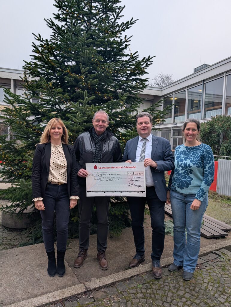 Einen Spendenscheck in Höhe von 3000 Euro für das Mosbacher Gymnasium über den Verein der Freunde konnten dieser Tage Schulleiter Jochen Herkert, die stellvertretende Schulleiterin Elvira Horvath sowie Nadine Slaby vom Förderverein entgegennehmen. Das Geld stammt aus einer privaten Stiftung. Stiftungsvorstand Horst Herdel würdigte bei der Übergabe die „wichtige und anspruchsvolle Arbeit“ der Lehrkräfte des Gymnasiums sowie der Mitglieder des Fördervereins. Er erinnerte daran, dass der Stiftungsgründerin Investitionen in Bildung und damit in die Zukunft stets ein besonderes Anliegen gewesen seien. „Gerade deshalb freue ich mich, Einrichtungen wie das Nicolaus-Kistner-Gymnasium unterstützen zu können“, betonte Herdel. Schulleiter Jochen Herkert zeigte sich „sehr dankbar“ für die großzügige Zuwendung durch die Stiftung. Mit dem Geld sollen zusätzliche Sitzgelegenheiten im Innenhof der Schule geschaffen werden, damit für die Schülerinnen und Schüler weitere attraktive Möglichkeiten entstehen.